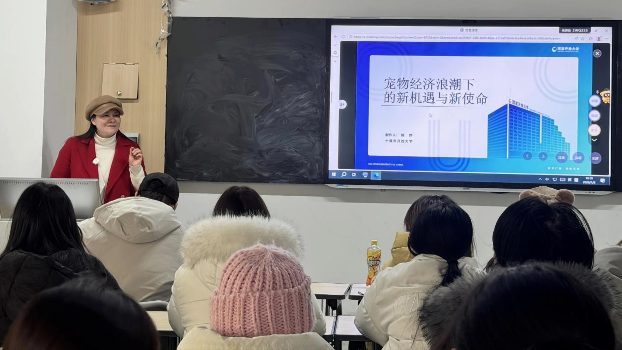 (通讯员 文/陈富坤 图/宋静) 2026年1月5日,十堰市开放大学畜牧兽医专业执业兽医熊烨老师走进旅商学院现代家政服务与管理专业课堂,开展“宠物经济浪潮下的新机遇与新使命”主题讲座。此次讲座打破专业壁垒与教育类型界限,以跨界融合视角搭建知识桥梁,为家政专业学子拓宽职业视野、强化社会担当注入新动能。